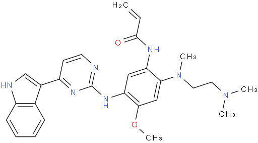 | Chemical Name | N-[2-(2-DIMETHYLAMINOETHYLMETHYLAMINO)-5-[[4-(1H-INDOL-3-YL)PYRIMIDIN-2-YL]AMINO]-4-METHOXYPHENYL]PROP-2-ENAMIDE |