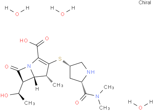 | Chemical Name | (4R,5S,6S)-3-(((3S,5S)-5-(Dimethylcarbamoyl)pyrrolidin-3-yl)thio)-6-((R)-1-hydroxyethyl)-4-methyl-7-oxo-1-azabicyclo[3.2.0]hept-2-ene-2-carboxylic acid trihydrate |